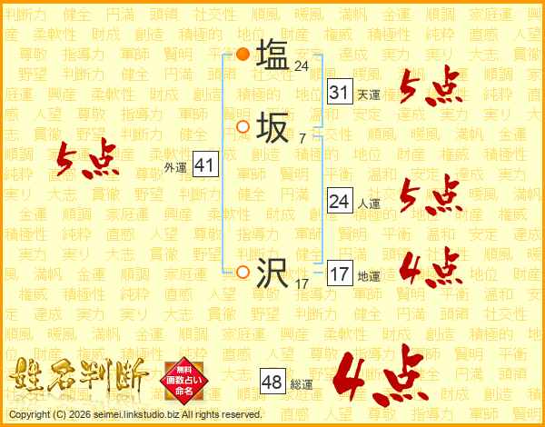 生活面を象徴する運勢です。外部から受ける影響力を表し、結婚運、家庭運や職場、環境への順応性を表します。総運から人運を引いた画数。姓や名が1文字の場合を除く。