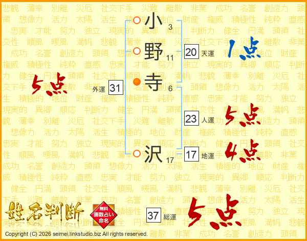 生活面を象徴する運勢です。外部から受ける影響力を表し、結婚運、家庭運や職場、環境への順応性を表します。総運から人運を引いた画数。姓や名が1文字の場合を除く。