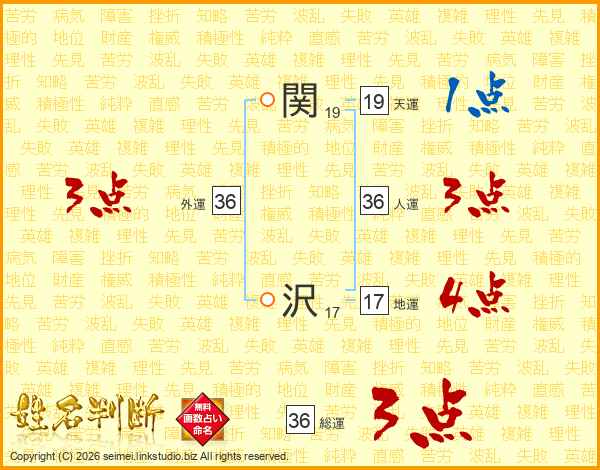 生活面を象徴する運勢です。外部から受ける影響力を表し、結婚運、家庭運や職場、環境への順応性を表します。総運から人運を引いた画数。姓や名が1文字の場合を除く。