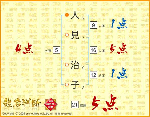 人(2画)見(7画) 治(9画)子(3画)