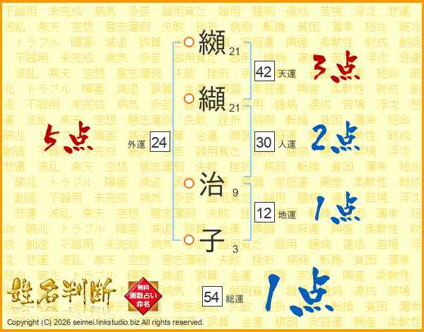 あなたの人生を表す1番重要な運勢です。生涯を通じて影響する総合運となり、主に50歳以降の晩年期に影響を及ぼします。苗字と名前の合計画数。