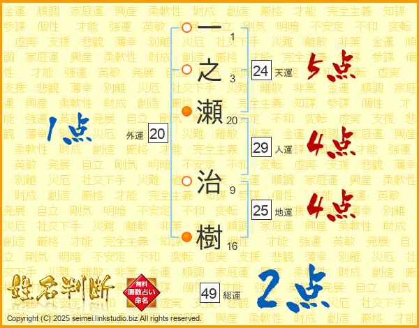 一(1画)之(3画)瀬(20画) 治(9画)樹(16画)