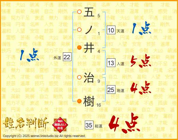 五(5画)ノ(1画)井(4画) 治(9画)樹(16画)