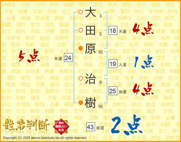 大(3画)田(5画)原(10画) 治(9画)樹(16画)