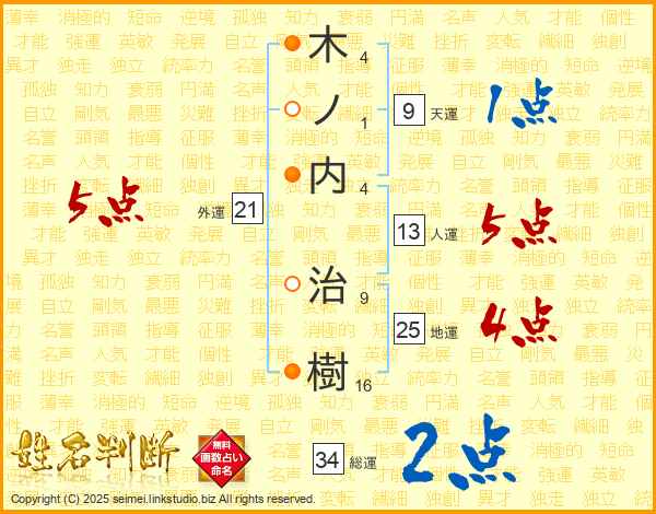木(4画)ノ(1画)内(4画) 治(9画)樹(16画)