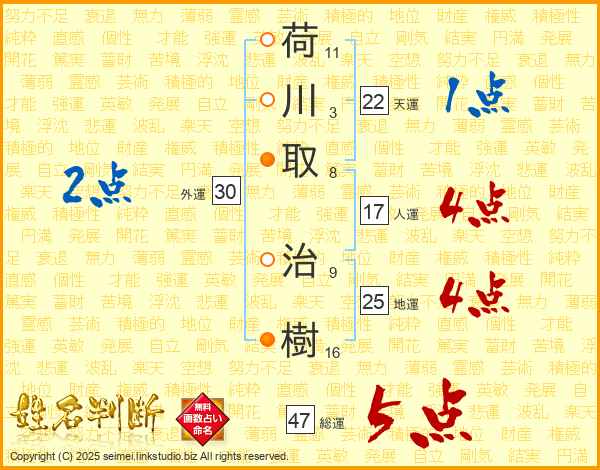 荷川取治樹さんの総運は47画の5点!