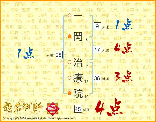 一(1画)岡(8画) 治(9画)療(17画)院(10画)