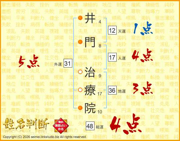 井(4画)門(8画) 治(9画)療(17画)院(10画)