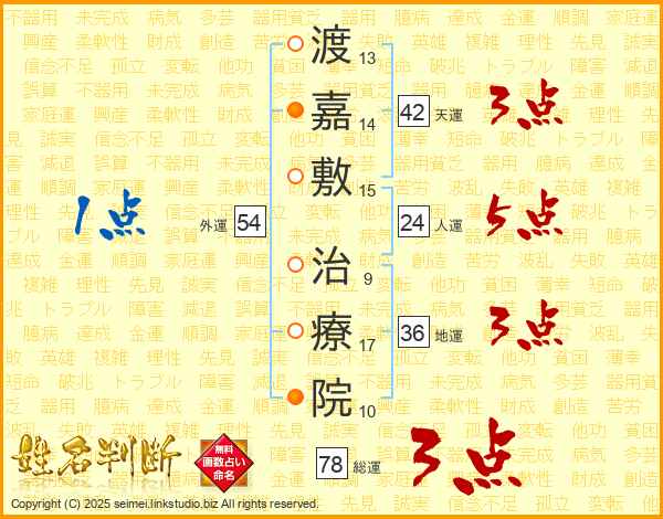 渡(13画)嘉(14画)敷(15画) 治(9画)療(17画)院(10画)
