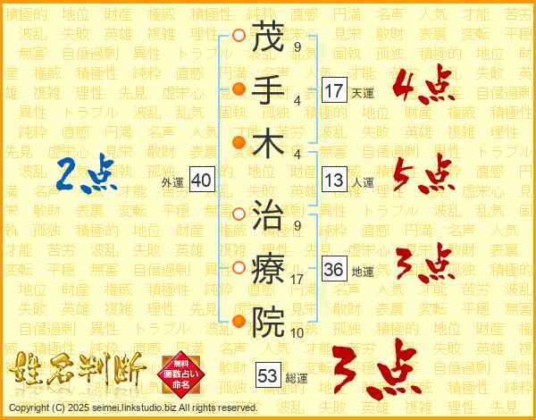 茂(9画)手(4画)木(4画) 治(9画)療(17画)院(10画)