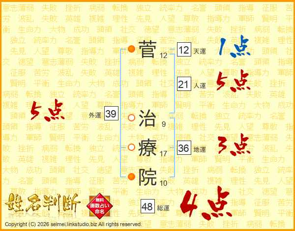 菅(12画) 治(9画)療(17画)院(10画)