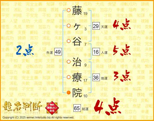 藤(19画)ヶ(3画)谷(7画) 治(9画)療(17画)院(10画)