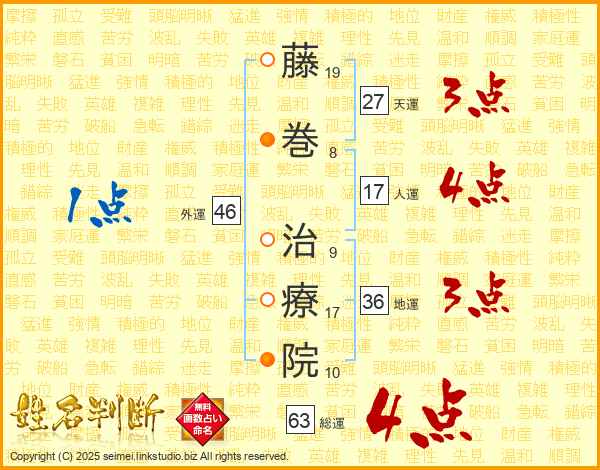 藤(19画)巻(8画) 治(9画)療(17画)院(10画)
