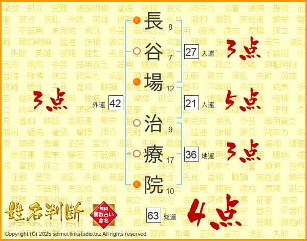 長(8画)谷(7画)場(12画) 治(9画)療(17画)院(10画)