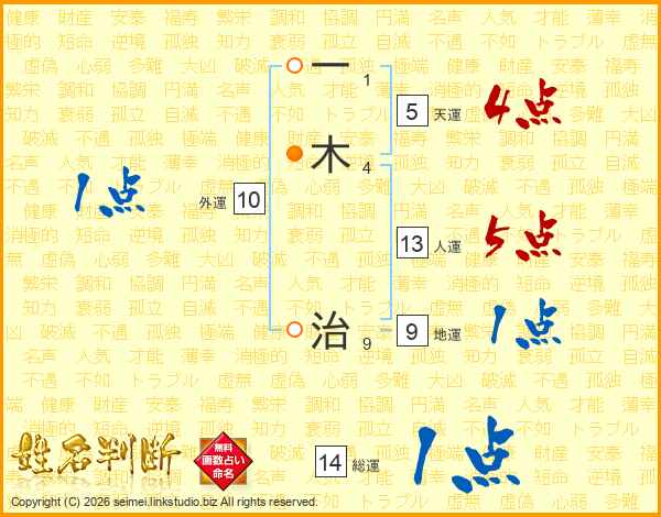 生活面を象徴する運勢です。外部から受ける影響力を表し、結婚運、家庭運や職場、環境への順応性を表します。総運から人運を引いた画数。姓や名が1文字の場合を除く。