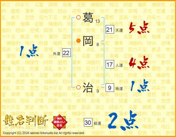 生活面を象徴する運勢です。外部から受ける影響力を表し、結婚運、家庭運や職場、環境への順応性を表します。総運から人運を引いた画数。姓や名が1文字の場合を除く。