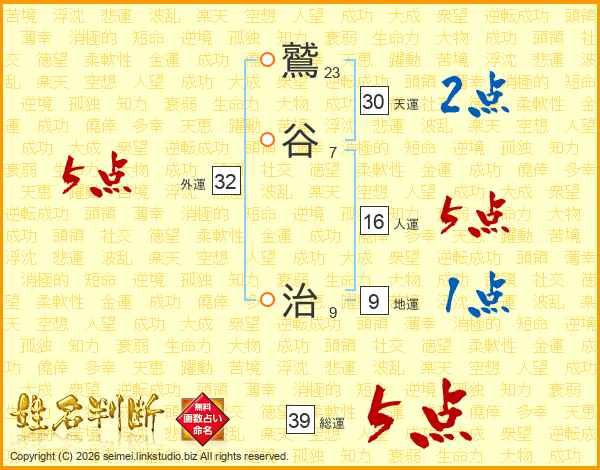 鷲谷治さんの総運は39画の5点!