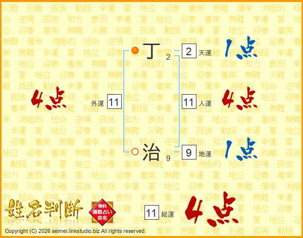 生活面を象徴する運勢です。外部から受ける影響力を表し、結婚運、家庭運や職場、環境への順応性を表します。総運から人運を引いた画数。姓や名が1文字の場合を除く。