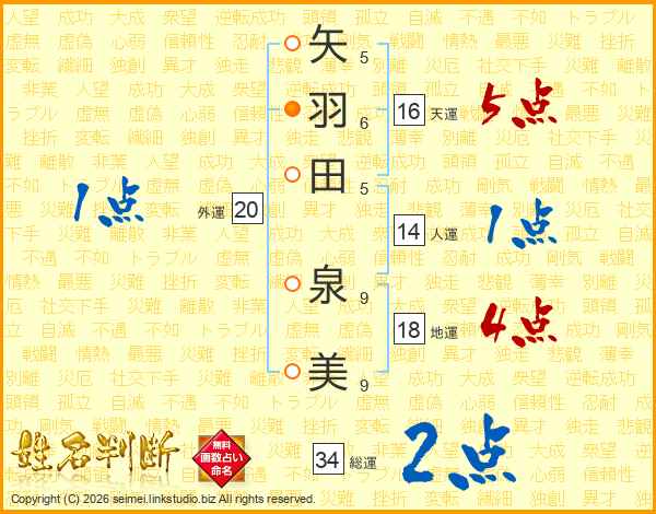 矢(5画)羽(6画)田(5画) 泉(9画)美(9画)