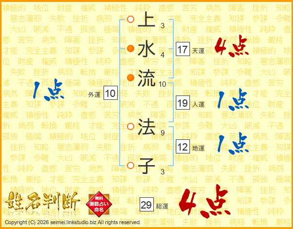 上(3画)水(4画)流(10画) 法(9画)子(3画)