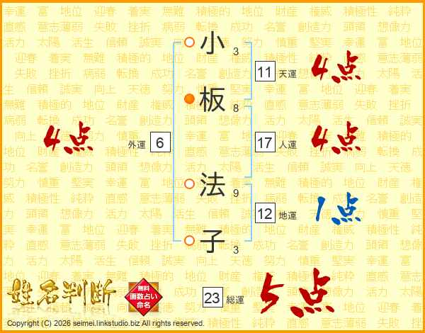 小板法子さんの総運は23画の5点!