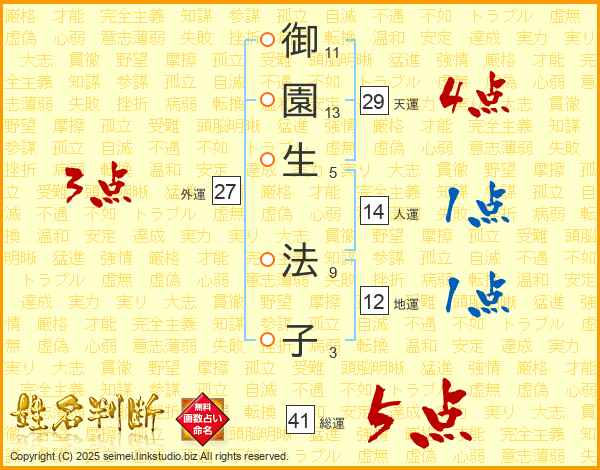 御(11画)園(13画)生(5画) 法(9画)子(3画)