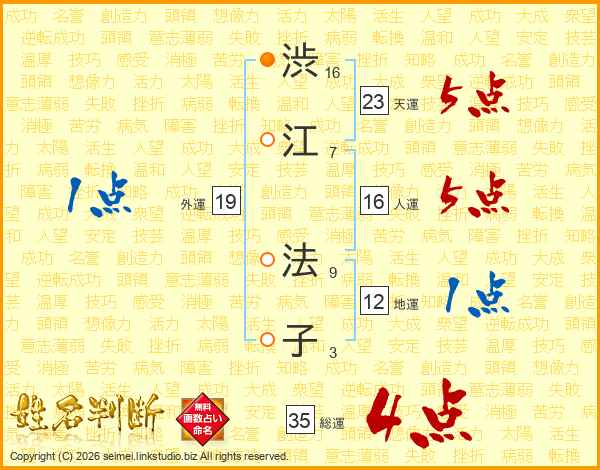 あなたの人生を表す1番重要な運勢です。生涯を通じて影響する総合運となり、主に50歳以降の晩年期に影響を及ぼします。苗字と名前の合計画数。