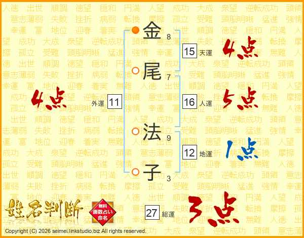 金(8画)尾(7画) 法(9画)子(3画)