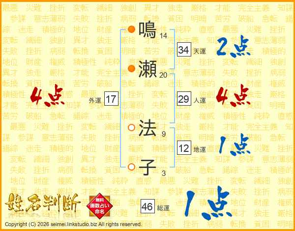 鳴(14画)瀬(20画) 法(9画)子(3画)