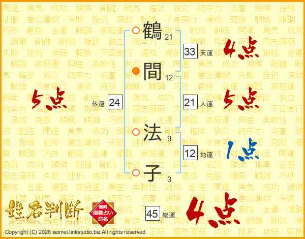 あなたの人生を表す1番重要な運勢です。生涯を通じて影響する総合運となり、主に50歳以降の晩年期に影響を及ぼします。苗字と名前の合計画数。