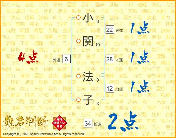 小(3画)関(19画) 法(9画)子(3画)