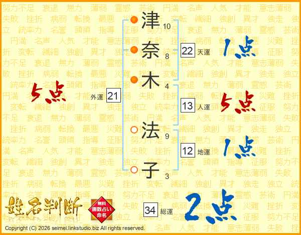 津(10画)奈(8画)木(4画) 法(9画)子(3画)