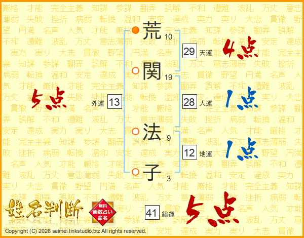 荒関法子さんの総運は41画の5点!