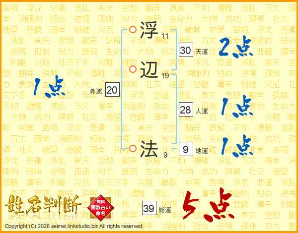 生活面を象徴する運勢です。外部から受ける影響力を表し、結婚運、家庭運や職場、環境への順応性を表します。総運から人運を引いた画数。姓や名が1文字の場合を除く。