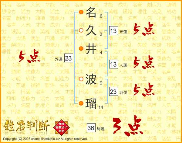 名(6画)久(3画)井(4画) 波(9画)瑠(14画)
