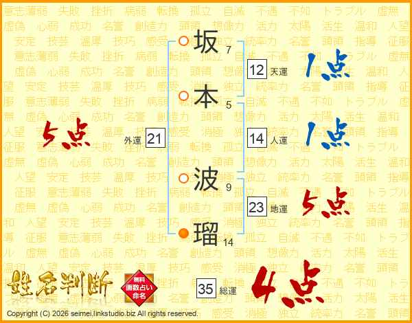 坂(7画)本(5画) 波(9画)瑠(14画)