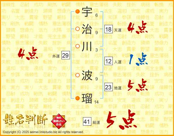 宇(6画)治(9画)川(3画) 波(9画)瑠(14画)