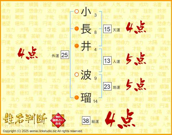 小(3画)長(8画)井(4画) 波(9画)瑠(14画)