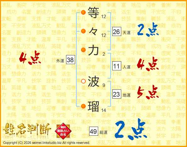 等(12画)々(12画)力(2画) 波(9画)瑠(14画)