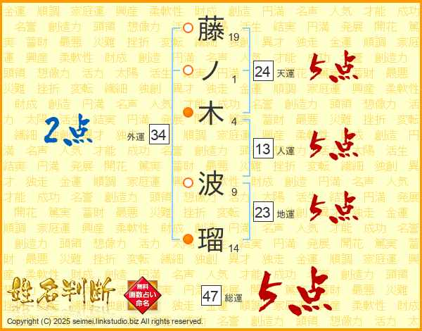 藤(19画)ノ(1画)木(4画) 波(9画)瑠(14画)