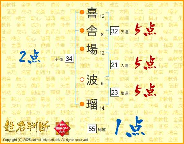 喜(12画)舎(8画)場(12画) 波(9画)瑠(14画)