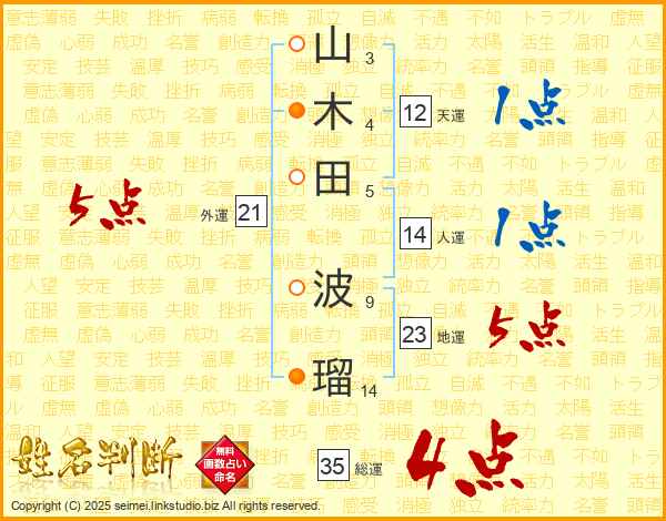 山(3画)木(4画)田(5画) 波(9画)瑠(14画)