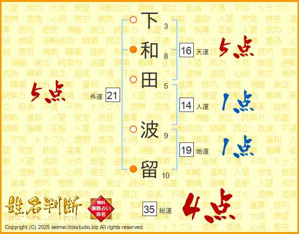 生活面を象徴する運勢です。外部から受ける影響力を表し、結婚運、家庭運や職場、環境への順応性を表します。総運から人運を引いた画数。姓や名が1文字の場合を除く。