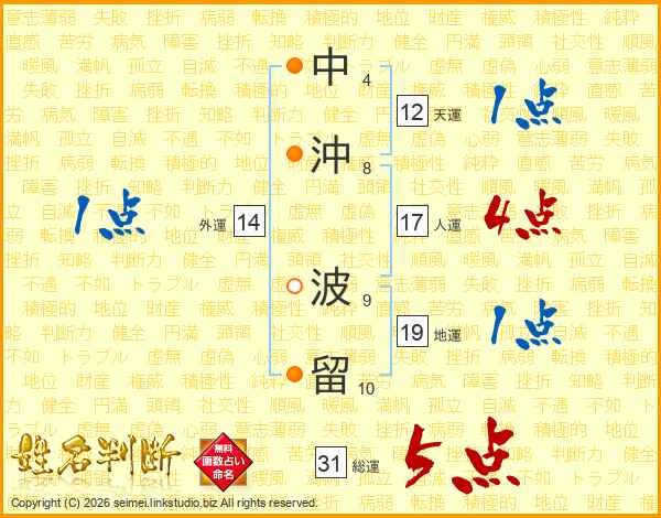 生活面を象徴する運勢です。外部から受ける影響力を表し、結婚運、家庭運や職場、環境への順応性を表します。総運から人運を引いた画数。姓や名が1文字の場合を除く。