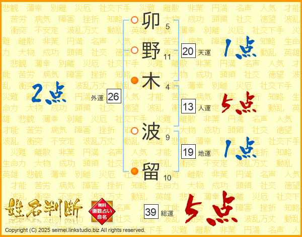 卯(5画)野(11画)木(4画) 波(9画)留(10画)