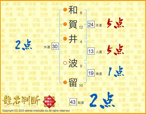 和(8画)賀(12画)井(4画) 波(9画)留(10画)