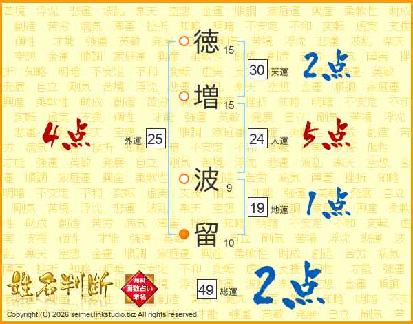 生活面を象徴する運勢です。外部から受ける影響力を表し、結婚運、家庭運や職場、環境への順応性を表します。総運から人運を引いた画数。姓や名が1文字の場合を除く。
