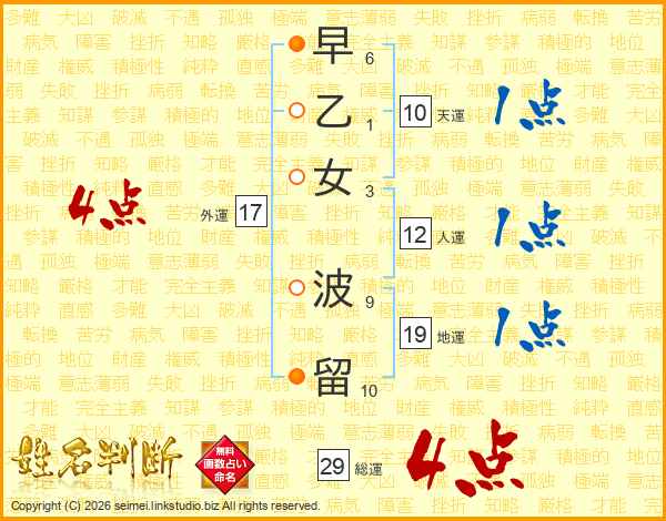 早(6画)乙(1画)女(3画) 波(9画)留(10画)