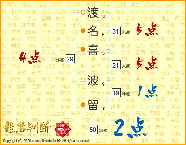 渡(13画)名(6画)喜(12画) 波(9画)留(10画)