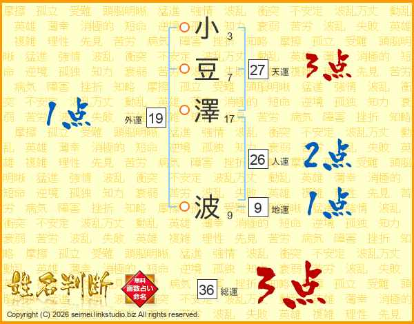 小(3画)豆(7画)澤(17画) 波(9画)